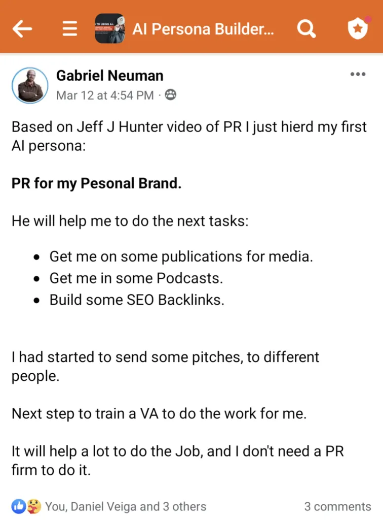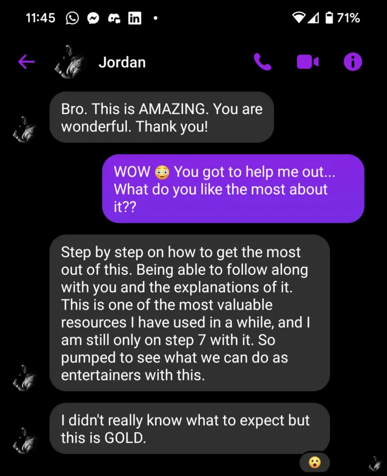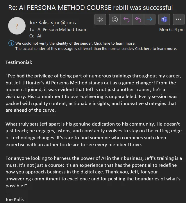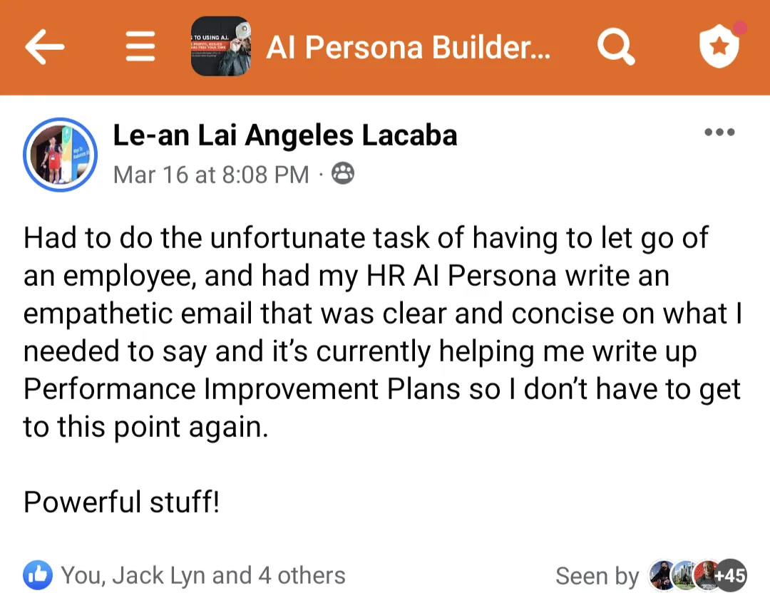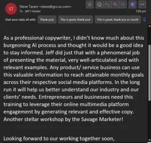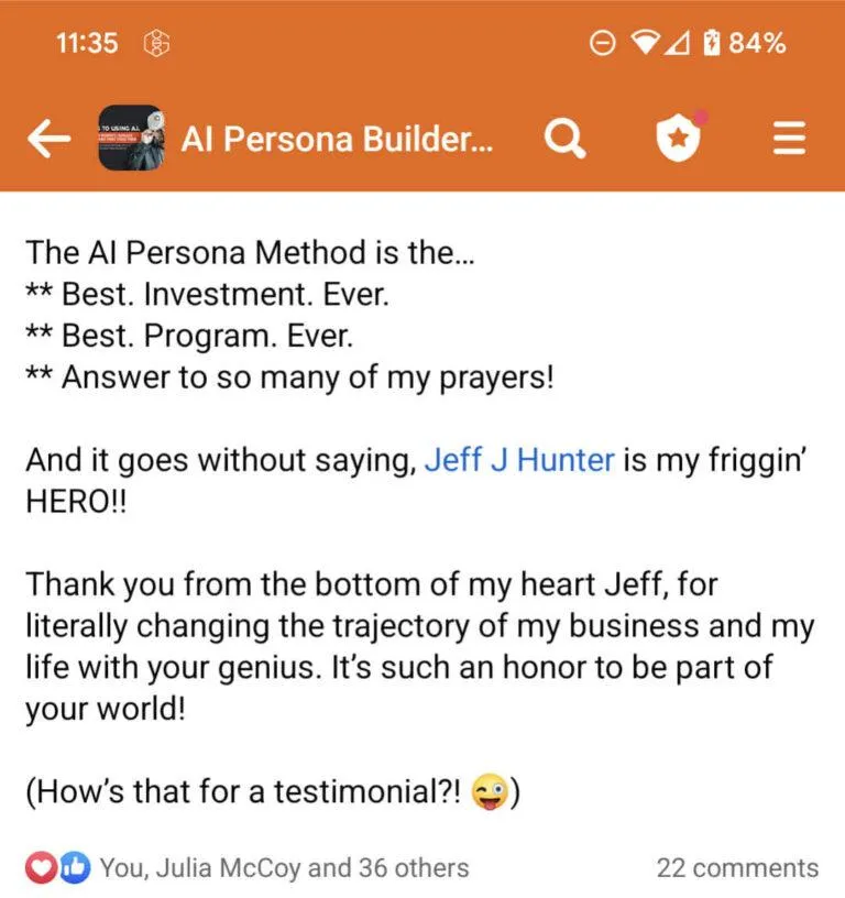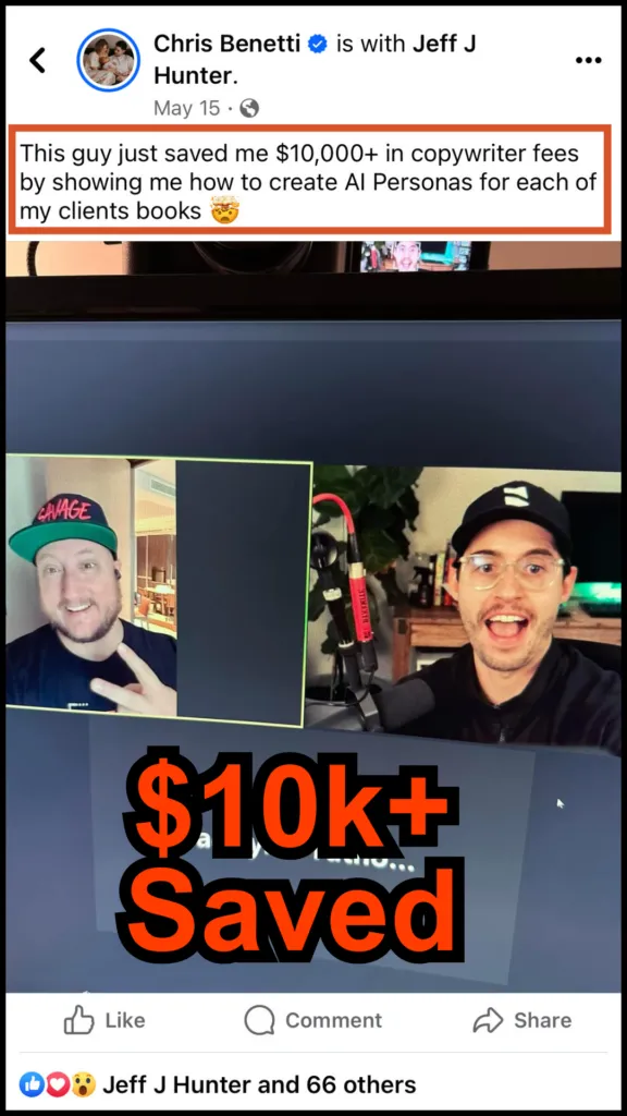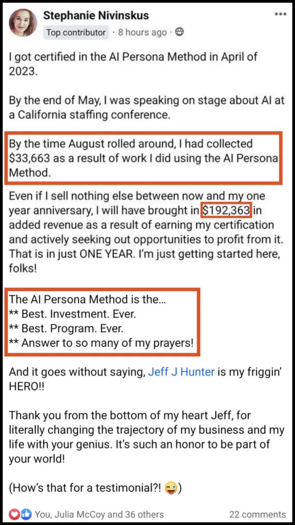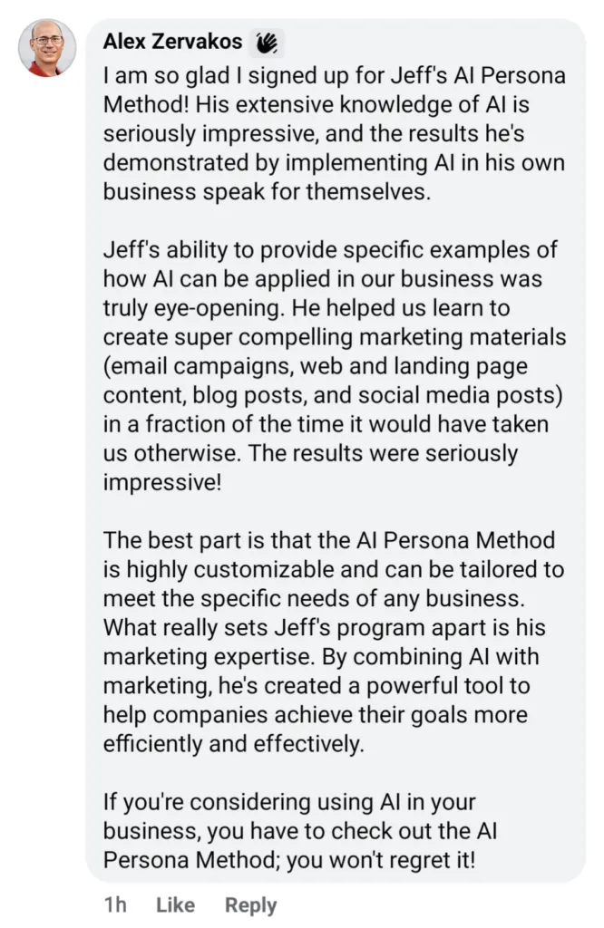 "I signed up for Billy Gene's AI workshop, and I felt like the speaker he paid a lot of money to teach us really didn't get it. The way that Jeff is using it is on a whole other level! I also did a few Udemy courses, and the AI Persona Method is far more advanced."