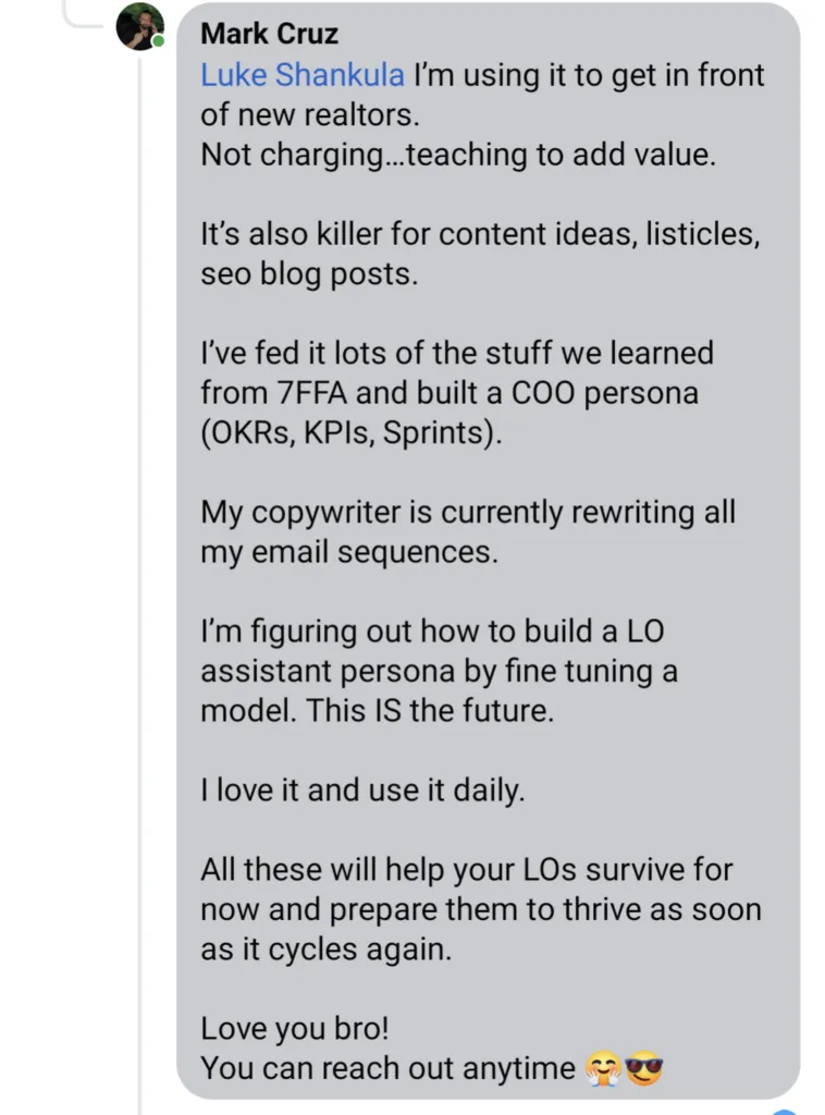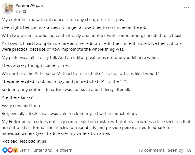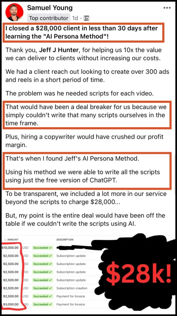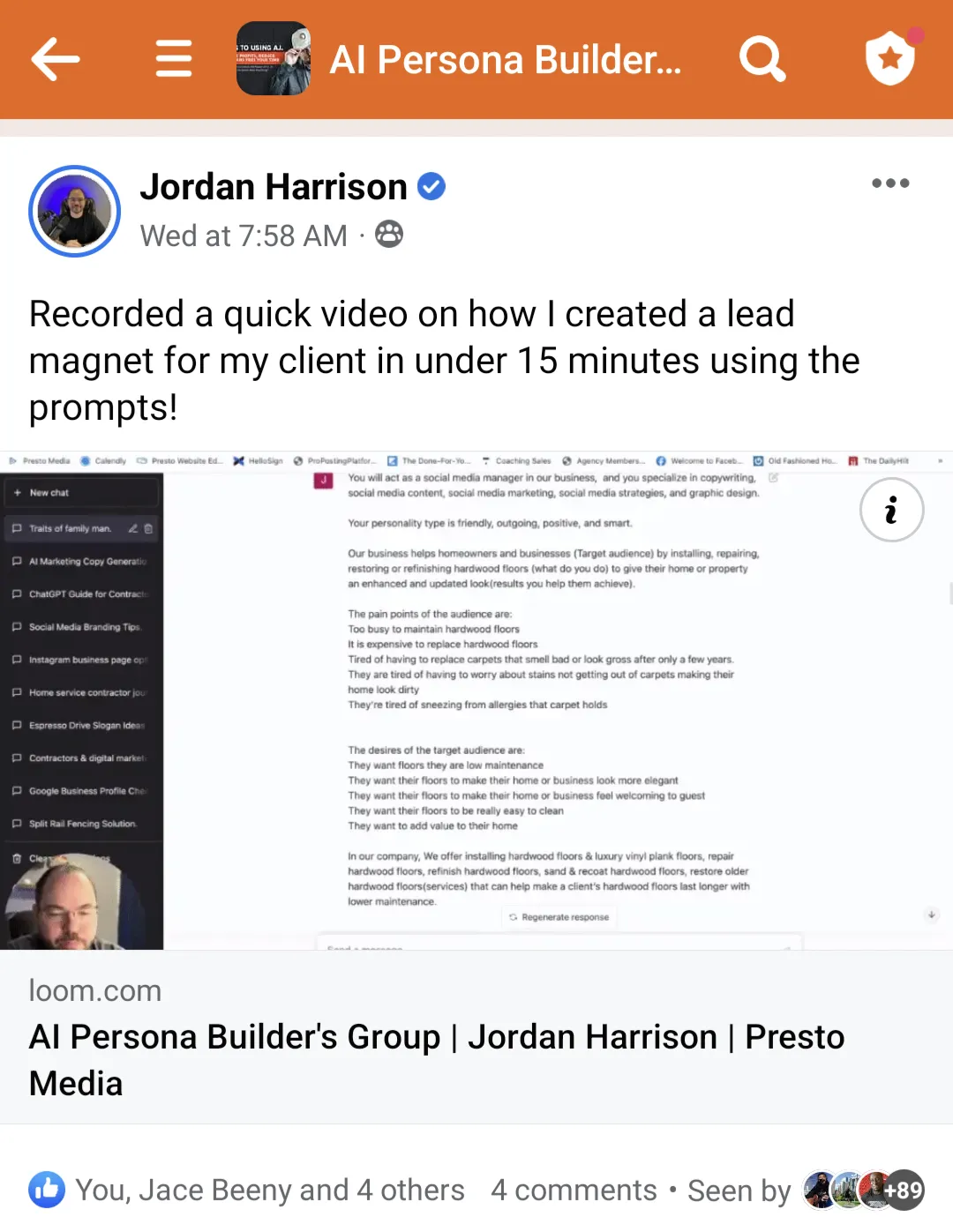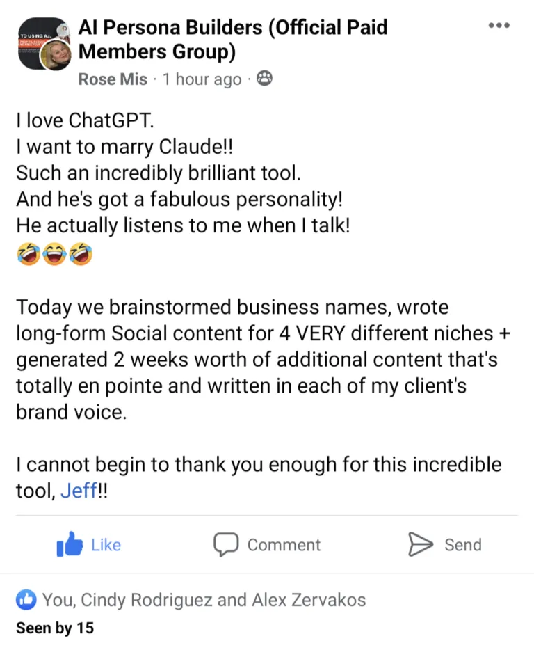 "I followed the exact prompts Jeff gave me step by step and wrote a social media post in 30 seconds... 24 hours after posting, my post had 41 comments..."